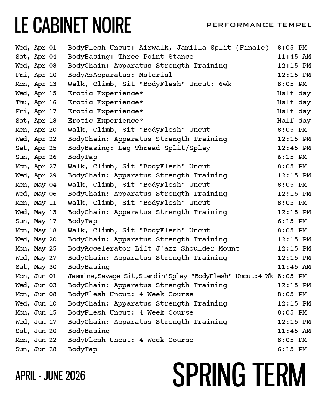 | Spring Term 2026 Apr-Jun Subscription (Virtual) | ![]() | Unlimited workshop and class appointment bookings each month. Includes: “BodyBasing” Floor Tricks/Poses, “BodyChain” Apparatus Strength Training, “BodyTap” Sexual Cultures Through Body & Visual Devices, “BodyFlesh” Uncut 6 Week Course, and “BodyasApparatus” Artistry workshops | $193.30 / month for 3 months | Book/Learn More |
